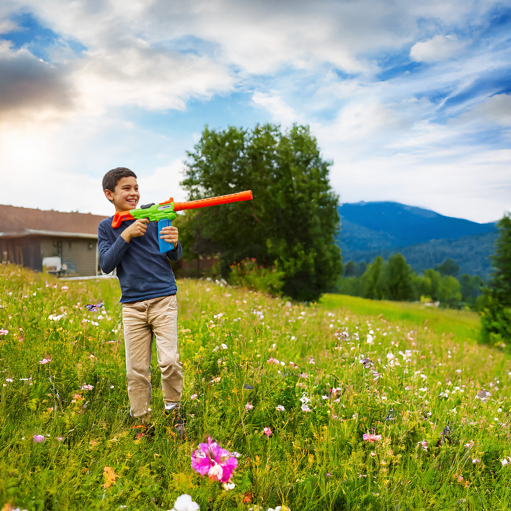 This foam dart rifle comes fully loaded with a banana clip, 20 Accu-Blast darts, a screw-in barrel, and a removable shoulder stock, allowing kids to customize their blaster for comfort and performance. Whether going for long-range shots or quick reloads, the Exterminator brings power and versatility to every battle.