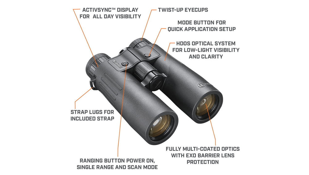 Superb ranging accuracy and advanced optics combine to make the best of both worlds in Bushnell’s Fusion X 10X42mm Ranging Binocular. Our HDOS—High-Definition Optical System—provides optimum viewing clarity, while the one-of-a-kind ActivSync™ Display means you’ll never again have trouble reading the ranging readout. Together, they make the Fusion X the one tool every hunter needs.