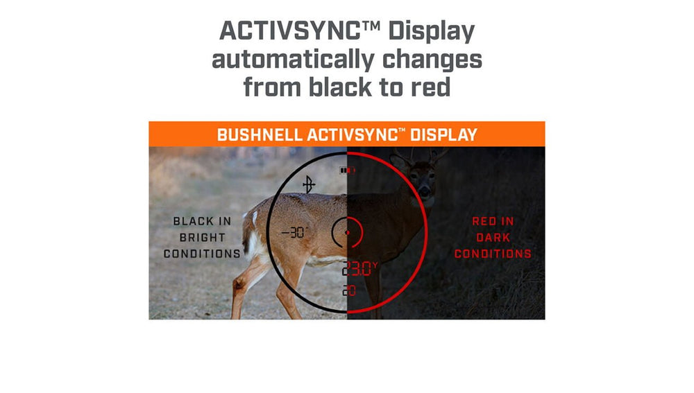 First of its kind ActivSync™ display technology fluidly morphs from black readouts against bright backgrounds to red readouts against dark ones, with infinitely variable tones. No more lost readings on game in deep cover. No more washed-out numbers on those super-bright cloudless days. No more guessing about whether you’re seeing a 600 or an 800 or ranging a buck or a tree. This is what best-in-class rangefinding was destined to be.