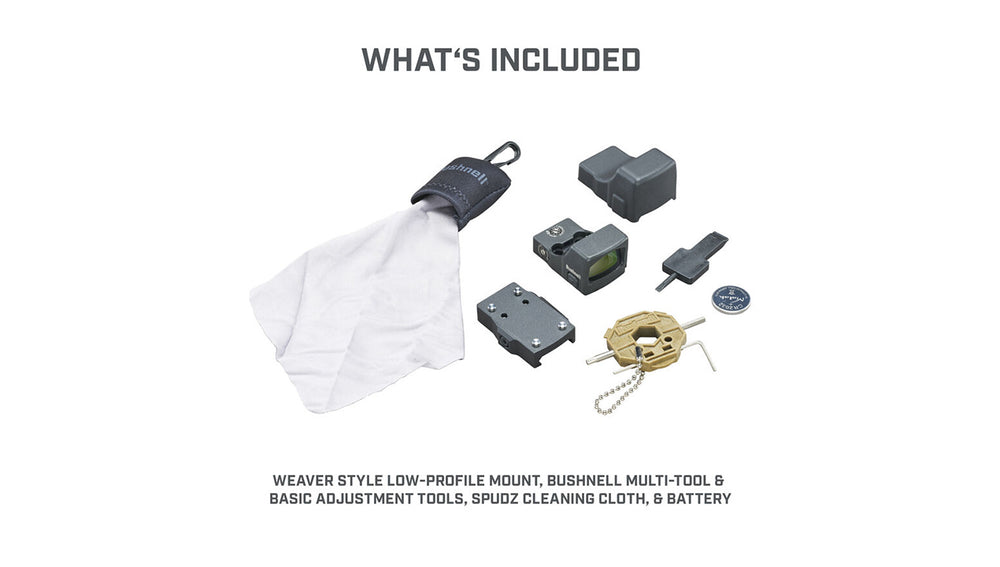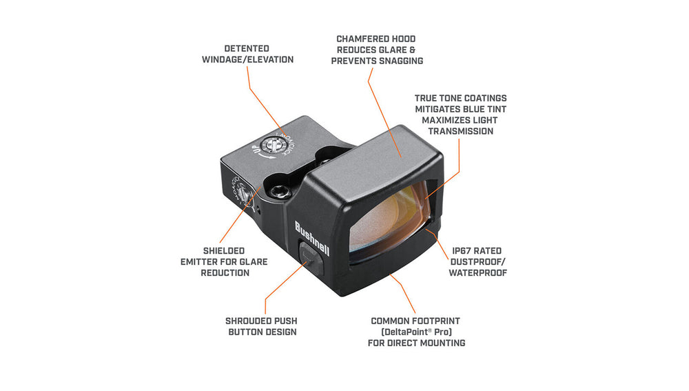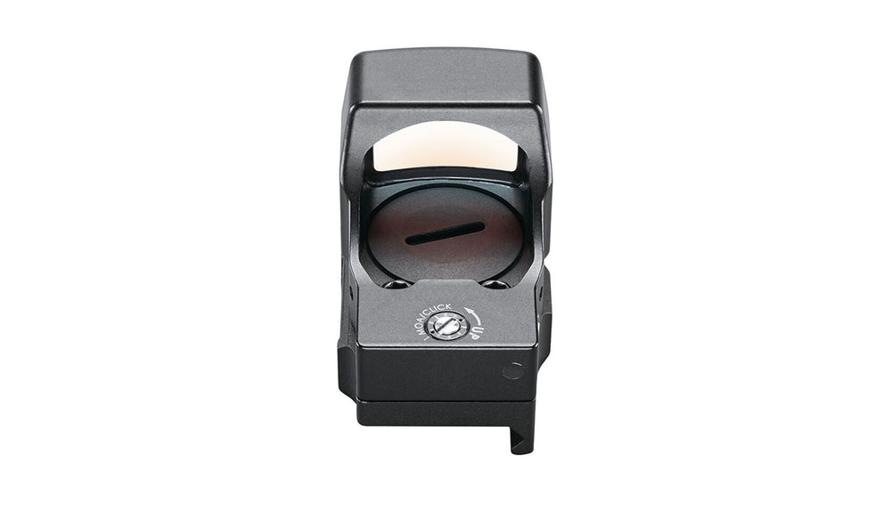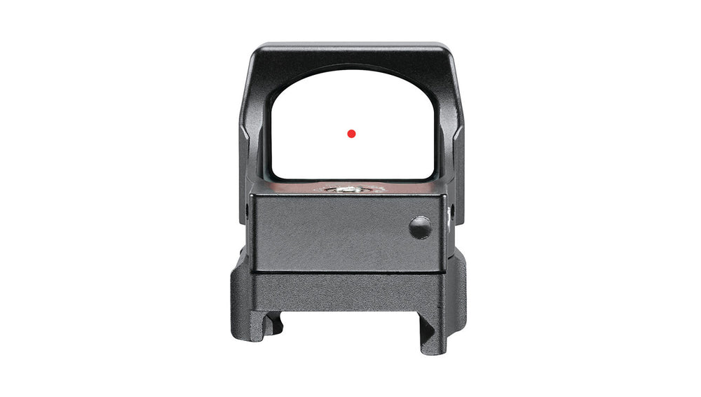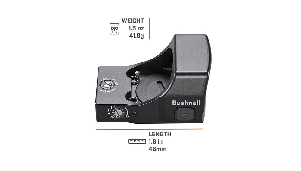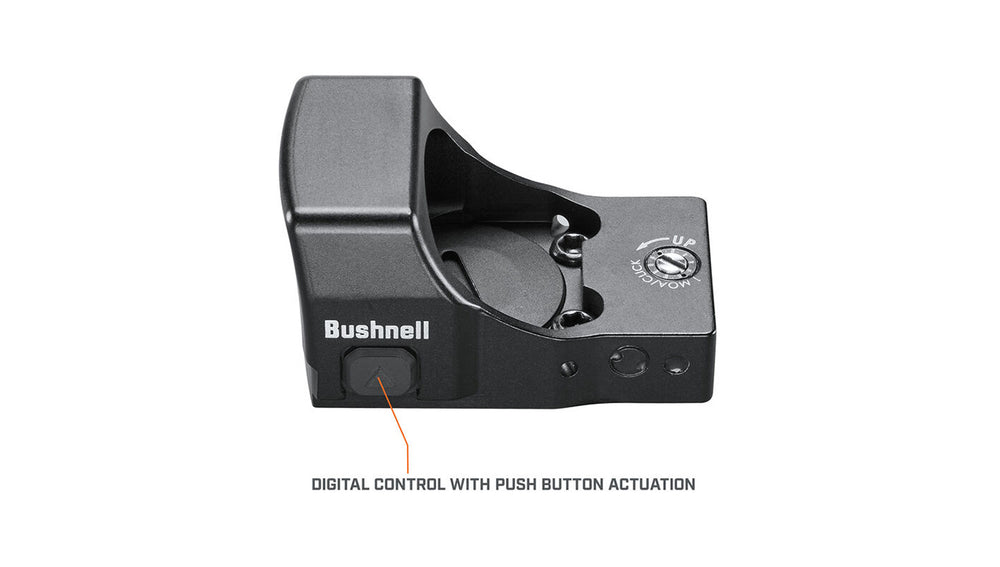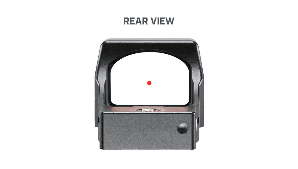 - CONVENIENT LAYOUT AND DESIGN Detented Windage/Elevation adjustment with 1 MOA per click. Top loading battery (CR2032) for easy replacement. Easy access, shrouded push button design for brightness setting adjustment. Chamfered hood edges protects the optic from the possibility of snags on clothing or environment. Includes protective form fit cover.