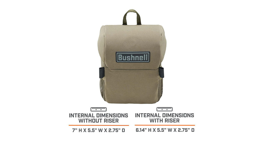 Fits up to 12x50 roof binoculars. Included Riser allows shorter binoculars to sit at the top of the pack.