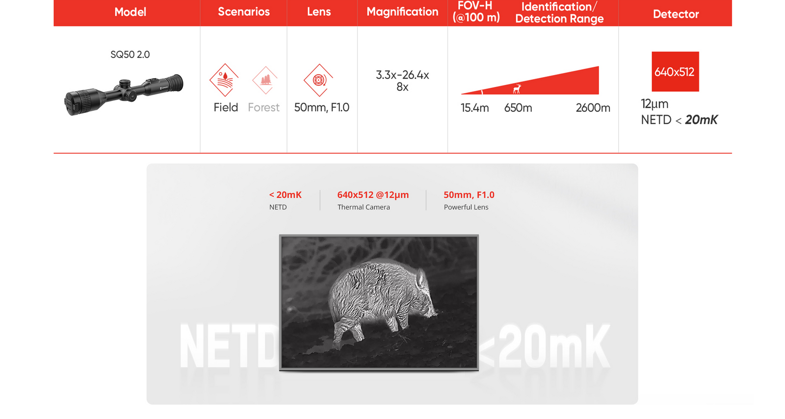This advanced riflescope ensures reliable target acquisition in total darkness, fog, or heavy vegetation. With a detection range of up to 1,800m and a fast 50Hz refresh rate, you’ll never miss a moment in the field.