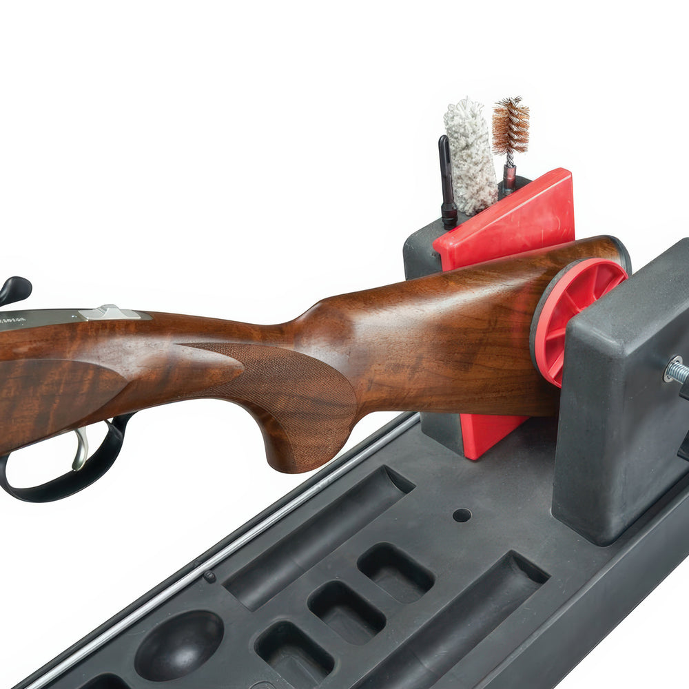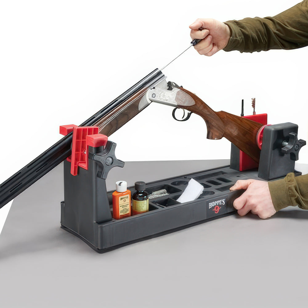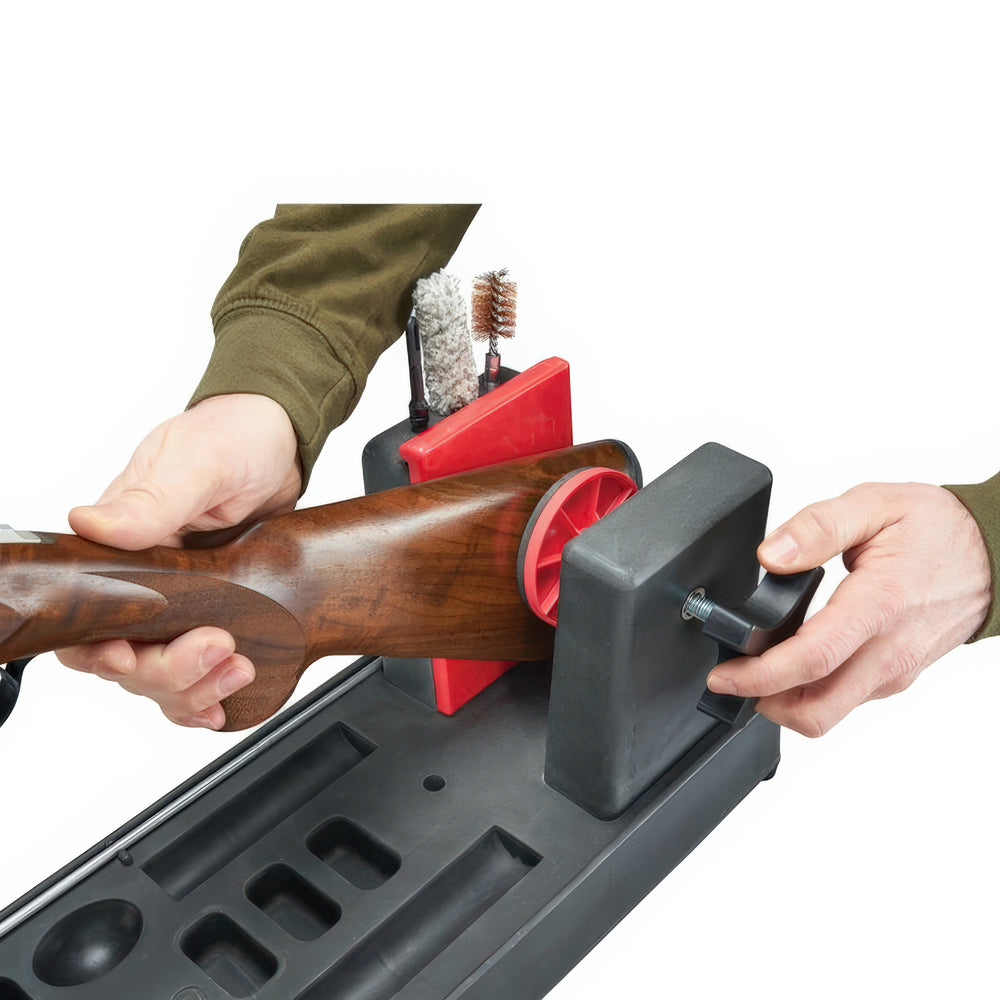 With its chemical-resistant polymer build and integrated compartments, the Hoppe’s Gun Vise offers both resilience and organization. Non-slip rubber contact points ensure a scratch-free grip, while multiple trays and slots keep tools and accessories neatly arranged. Designed for hunters and firearm owners who demand both function and form, this vise provides a clean, steady work area every time.