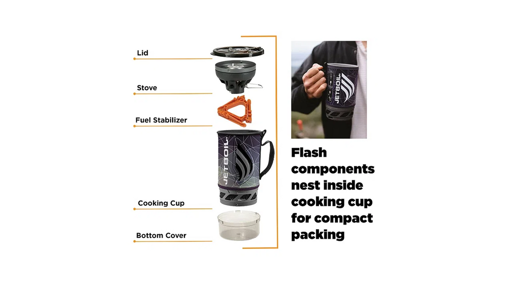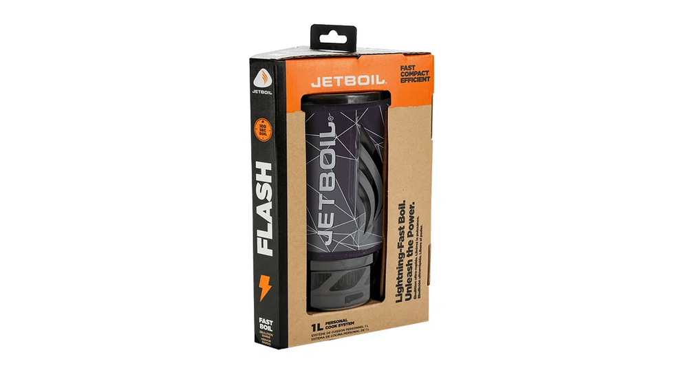Blistering boil times come standard on the Flash personal cooking system, the ultimate camping stove for preparing coffee, soup, or dehydrated meals on the trail. Optimized for efficiency, the Flash boils water in a lightning-quick 100 seconds, making it the fastest Jetboil ever. Jetboil's 1-liter FluxRing cooking cup with insulating cozy makes boiling water—and keeping it warm—a breeze. Start heating instantly with the convenient, reliable pushbutton igniter, and verify that the water's ready with the thermochromatic color-change heat indicator.