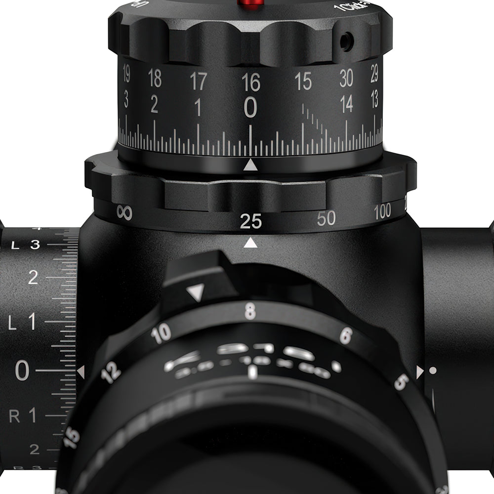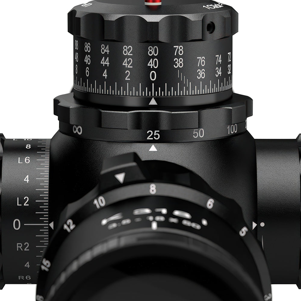 Depending on the model, the turret clicks are in either MOA or MRAD. Each ¼ MOA click adjusts point of impact by 0.741 cm at 100 meters, while each 0.1 MRAD click adjusts impact by exactly 1 cm at 100 meters. This provides precise, measurable adjustments ideal for long-range shooting.