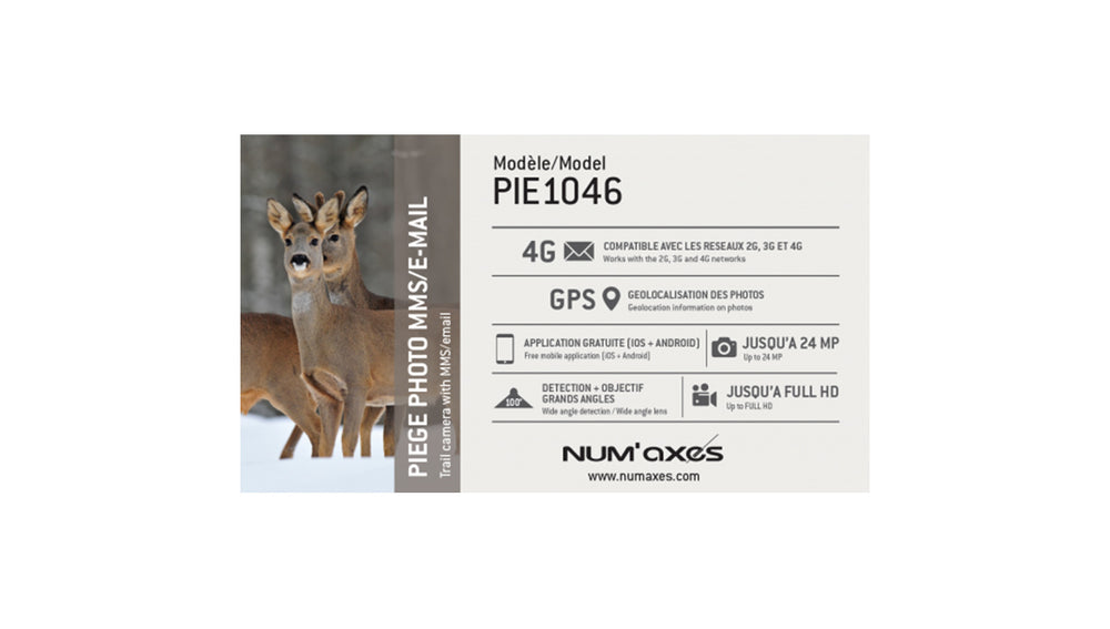 With the PIE1046 trail camera, you will receive the photos or videos captured (photos by MMS or Email, videos by Email). A built-in GPS antenna allows you to have geolocation information printed on the photos. When you insert the SIM card (standard size), the camera will automatically detect the mobile operator and setup the...