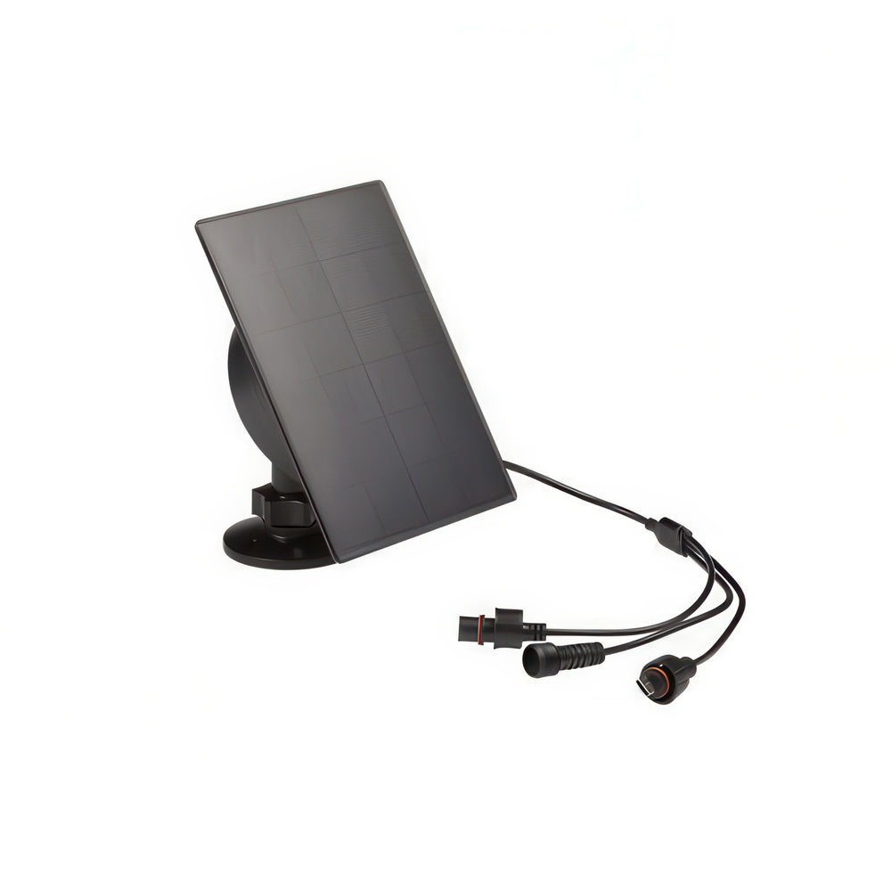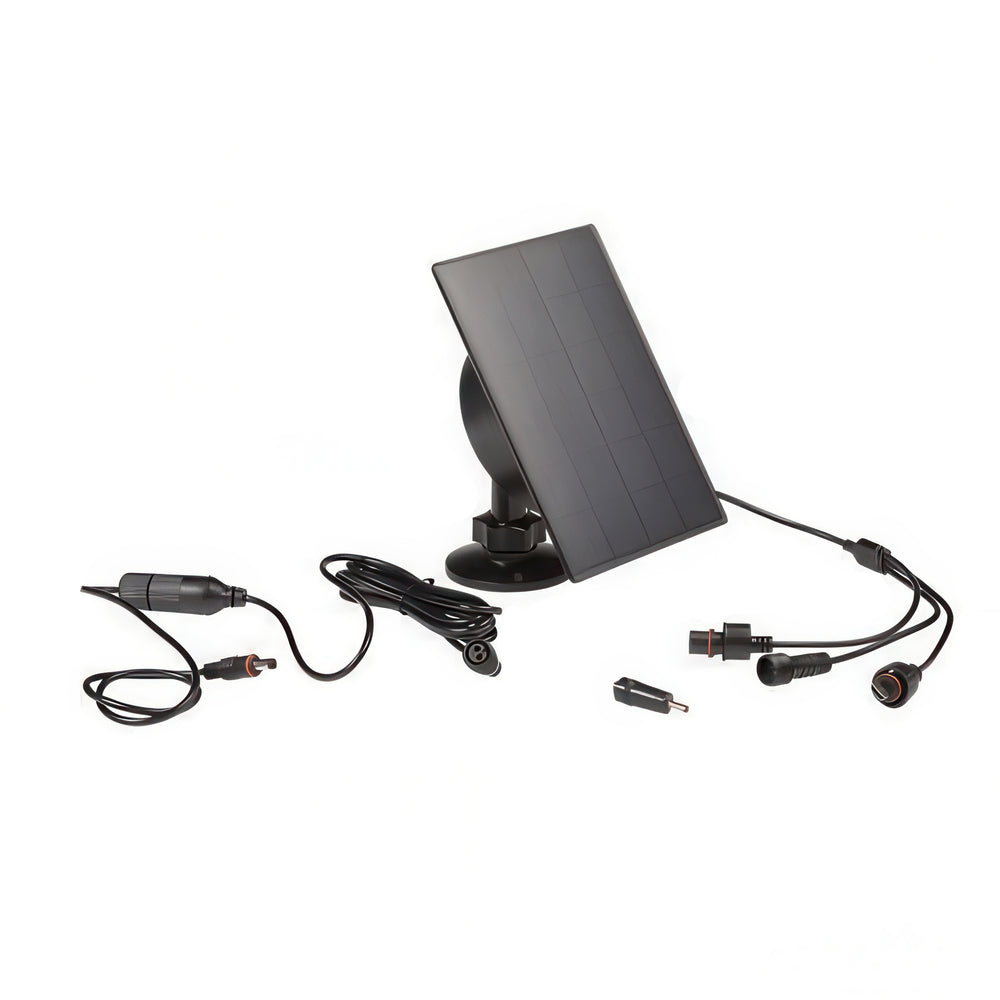 The solar panel features a compact design and a 2.5-meter output cable for easy installation. A charge indicator allows you to monitor battery status at a glance.