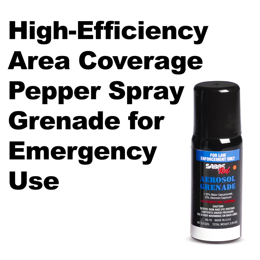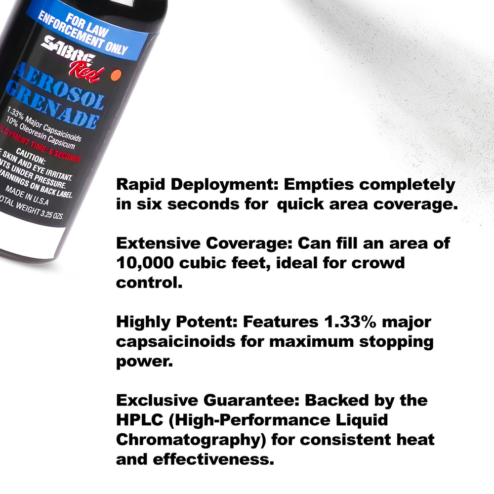 The Sabre Red 1.33 percent MC, 2.0 oz., MK-3 Fog Delivery Aerosol Grenade empties in six (6) seconds, filling an area of 10,000 cubic feet in 60 seconds. Offering a unique combination of intense MC heat with a wide-area fog delivery, it provides immediate and effective deterrence.