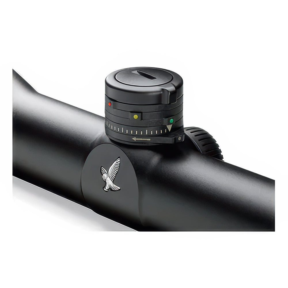 The package includes transparent scope covers, a ballistic turret tool, a replacement battery with a dedicated holder, a Swarovski Optik rail cover (for SR models), and a microfiber cloth for maintenance.