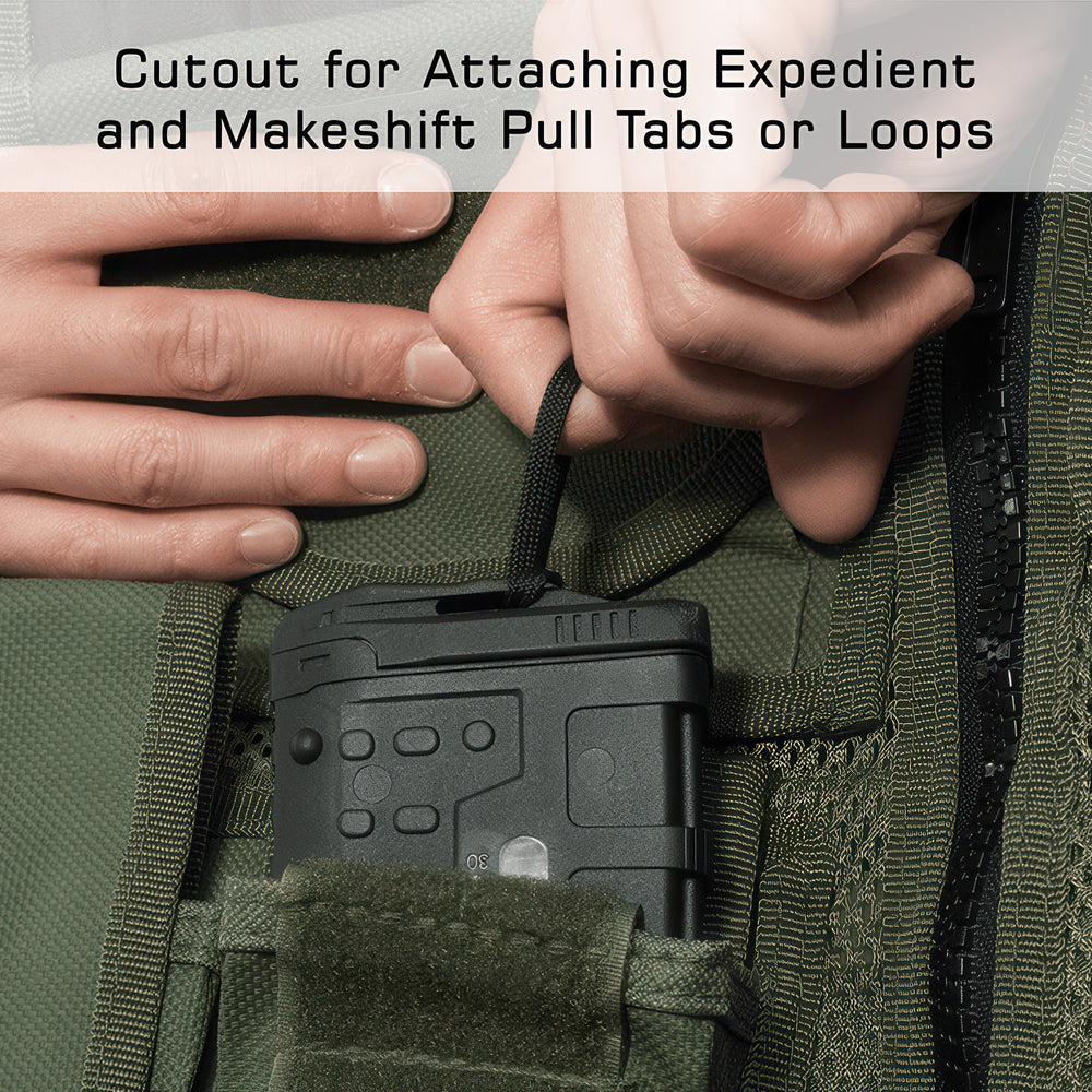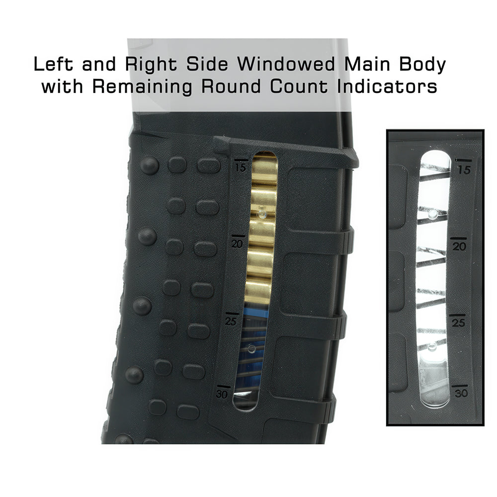 Positive grip texturing, left and right side windowed main body with remaining round count indicators, an over-insertion stop, and a removable flared floor plate complete the design.