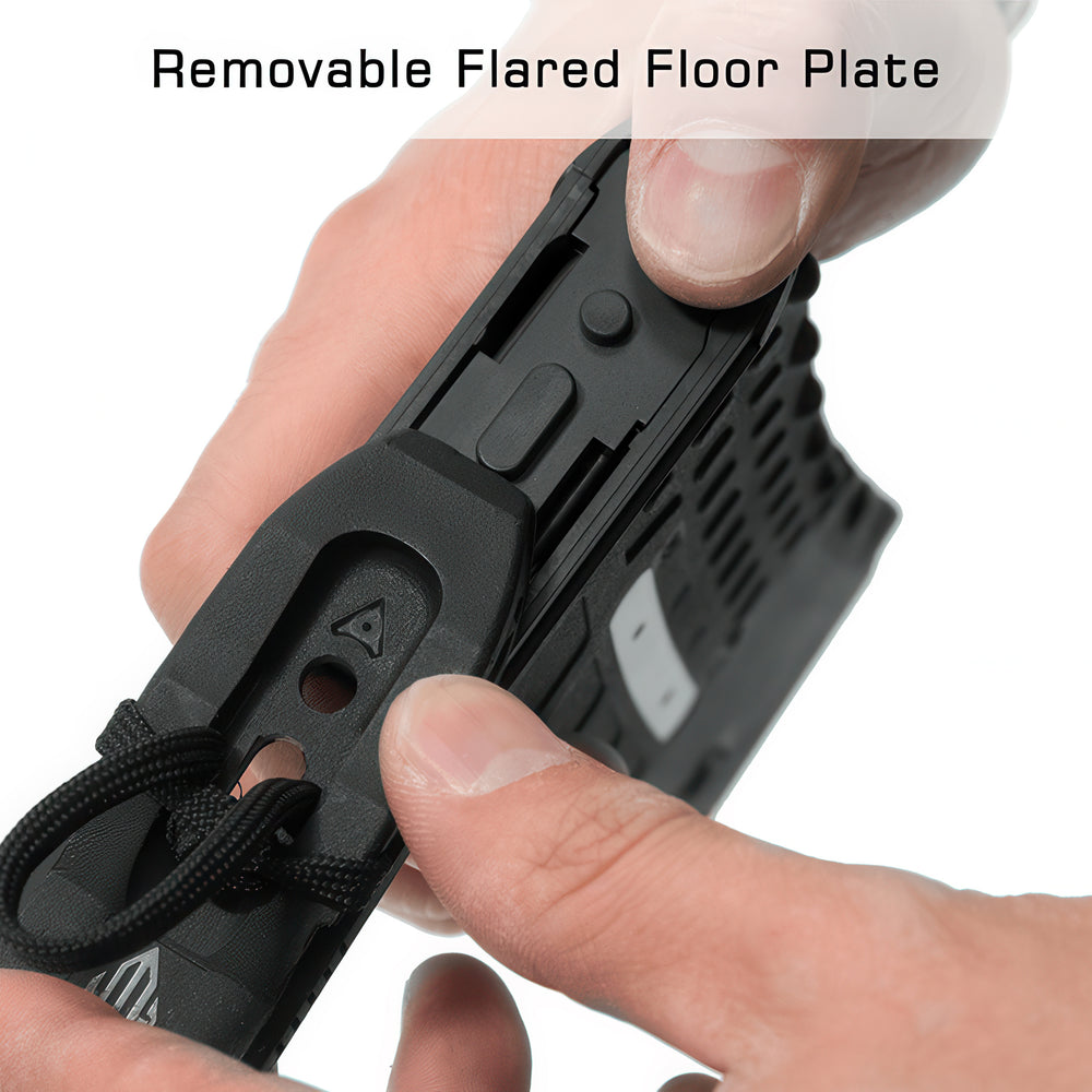 Its ergonomic texturing and removable flared floor plate enhance grip and usability, making it a reliable choice for both novice and experienced shooters.