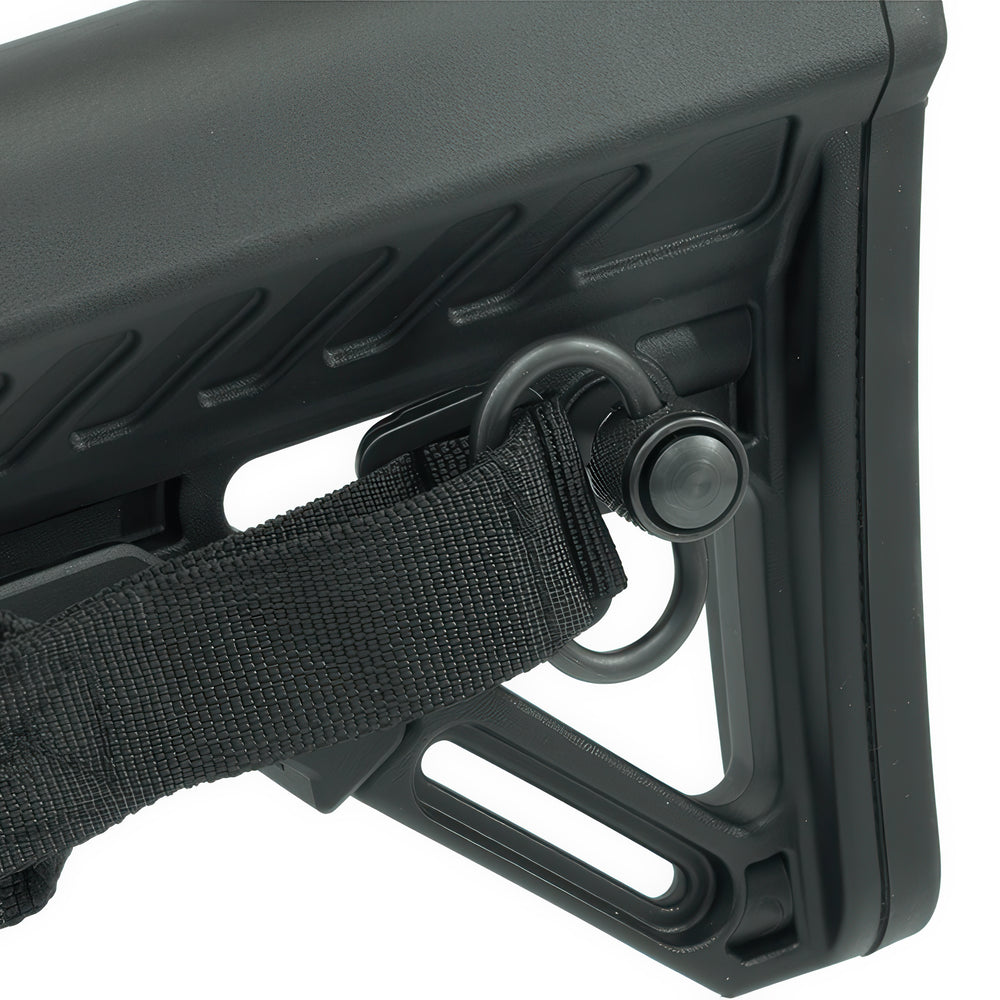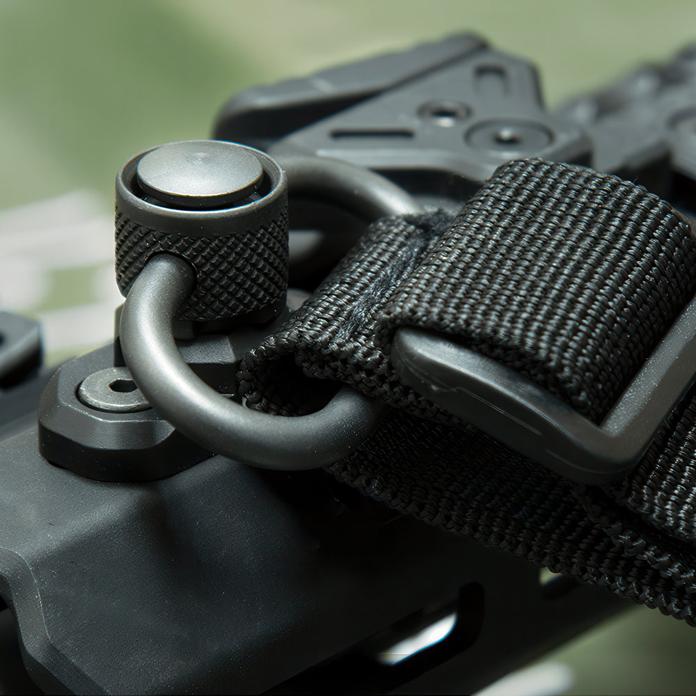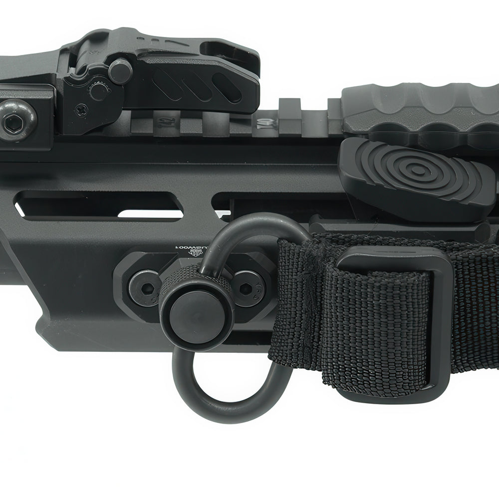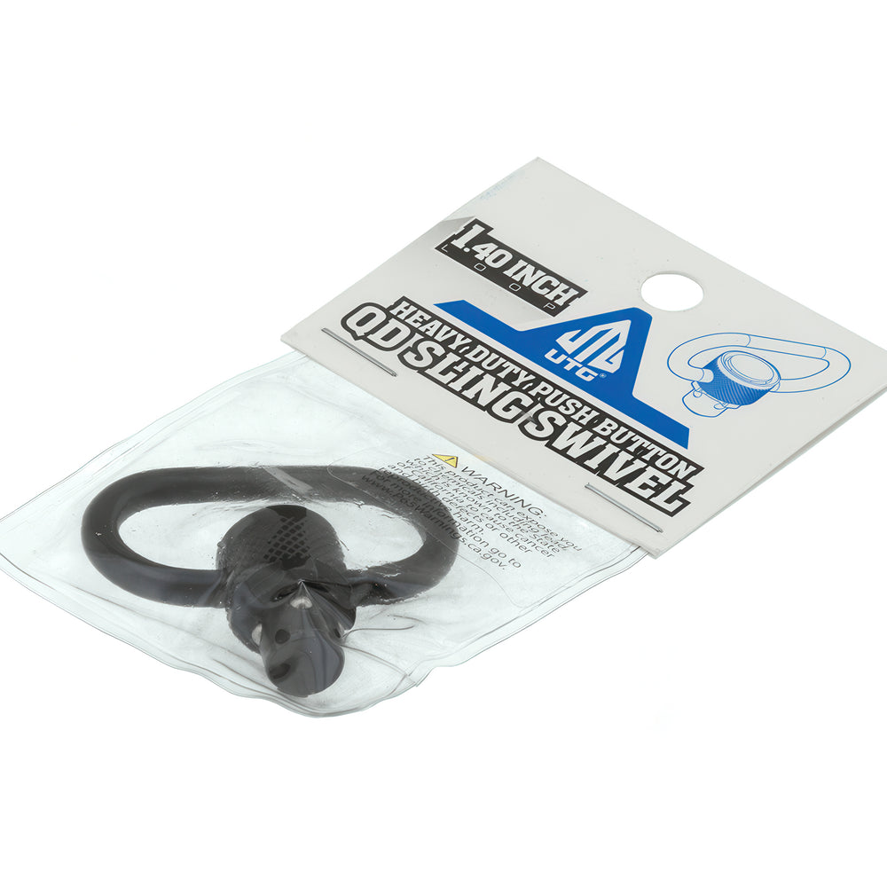 Engineered for strength and durability, the UTG Heavy Duty QD Sling 1.4” Swivel Loop is crafted from steel and finished in a sleek matte black coating.