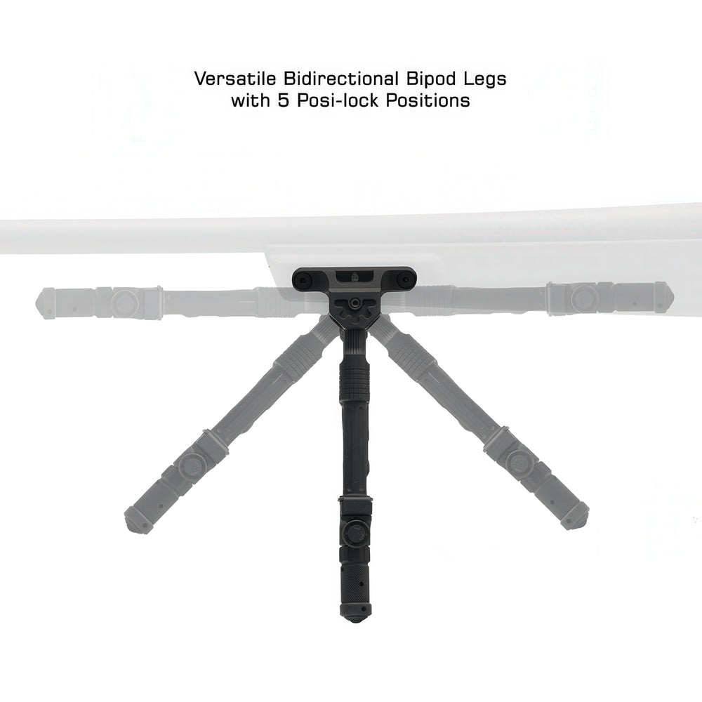 The 5-position foldable legs lock in at various angles (0°, 45°, 90°, 135°, 180°) to support different shooting styles and environments. Built-in automatic leg extension enables quick deployment, while non-slip rubberized foot pads ensure a firm grip on any terrain. Compatible with most aftermarket pads via QD locking detent.