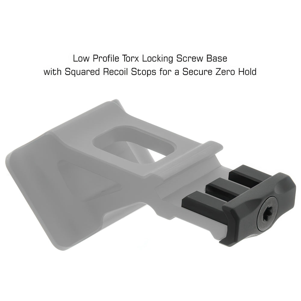 Precision CNC machined from 6061-T6 aircraft-grade aluminum, it offers enhanced durability with a matte black anodized finish for a professional look. The low-profile Torx locking screw base with squared recoil stops ensures secure zero retention in all conditions.