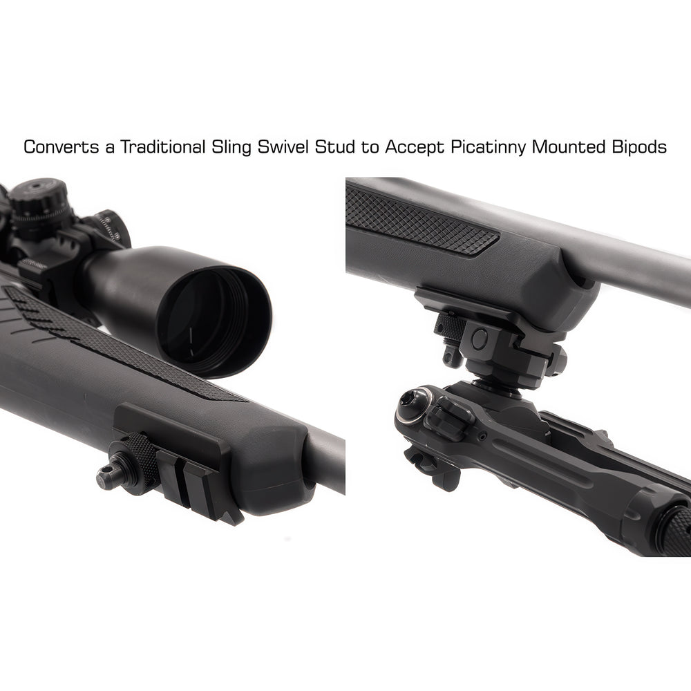 - Converts a traditional sling swivel stud to accept Picatinny-mounted bipods.