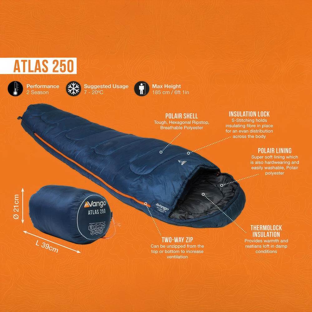 Compact, warm, and built for durability, the Atlas 250 sleeping bag is the perfect choice for festival-goers and first-time campers. Designed for 2-season use, it features a soft-touch Polair® polyester shell that is both hardwearing and machine washable. The mummy shape helps retain heat while keeping the overall weight down to just 1.25kg, making it ideal for travel and quick getaways.