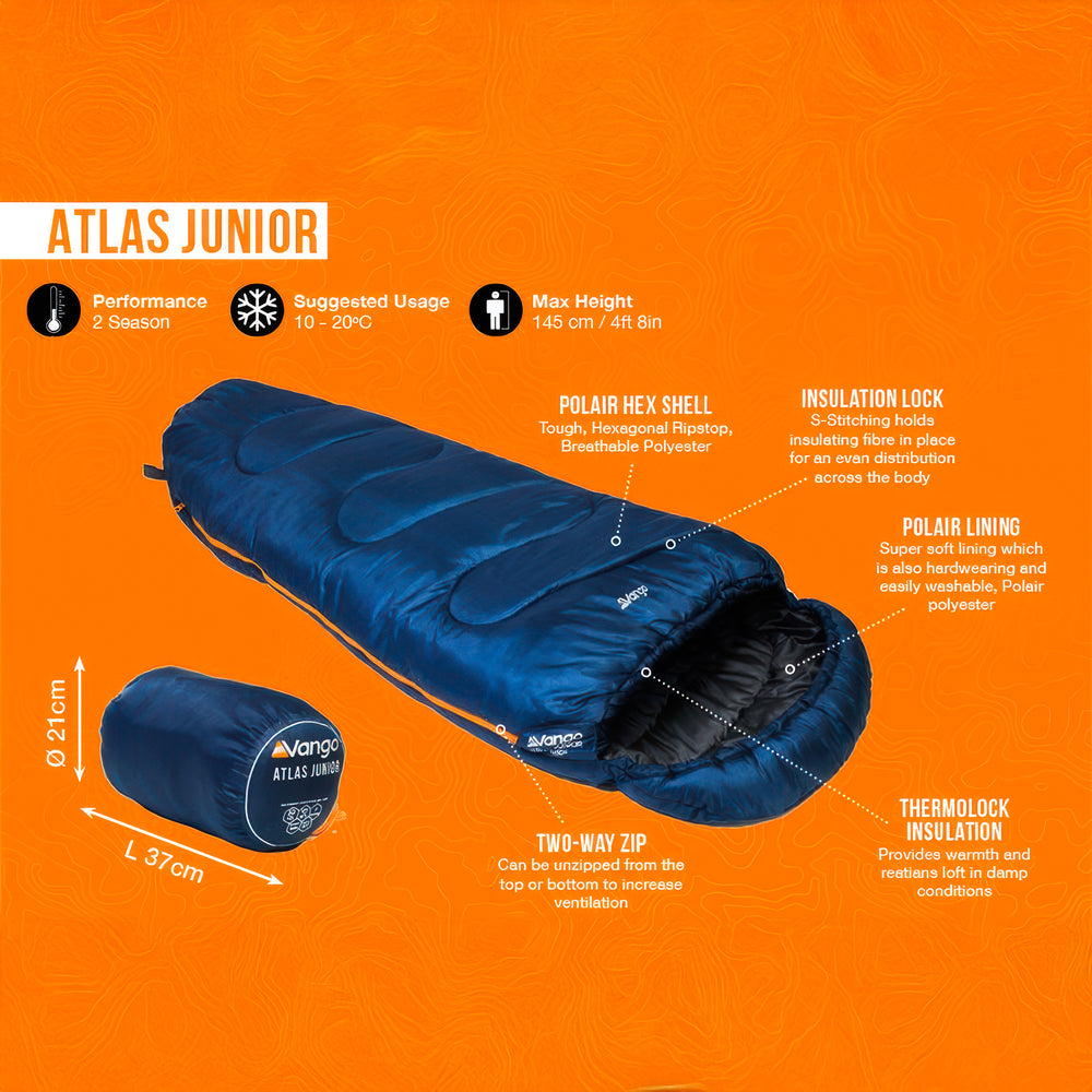 The Vango Atlas Junior sleeping bag uses a superior fill designed to be durable, warm and lightweight while retaining its loft and soft touch. It is made with 30% single hole siliconised hollow fibre and 70% polyester.