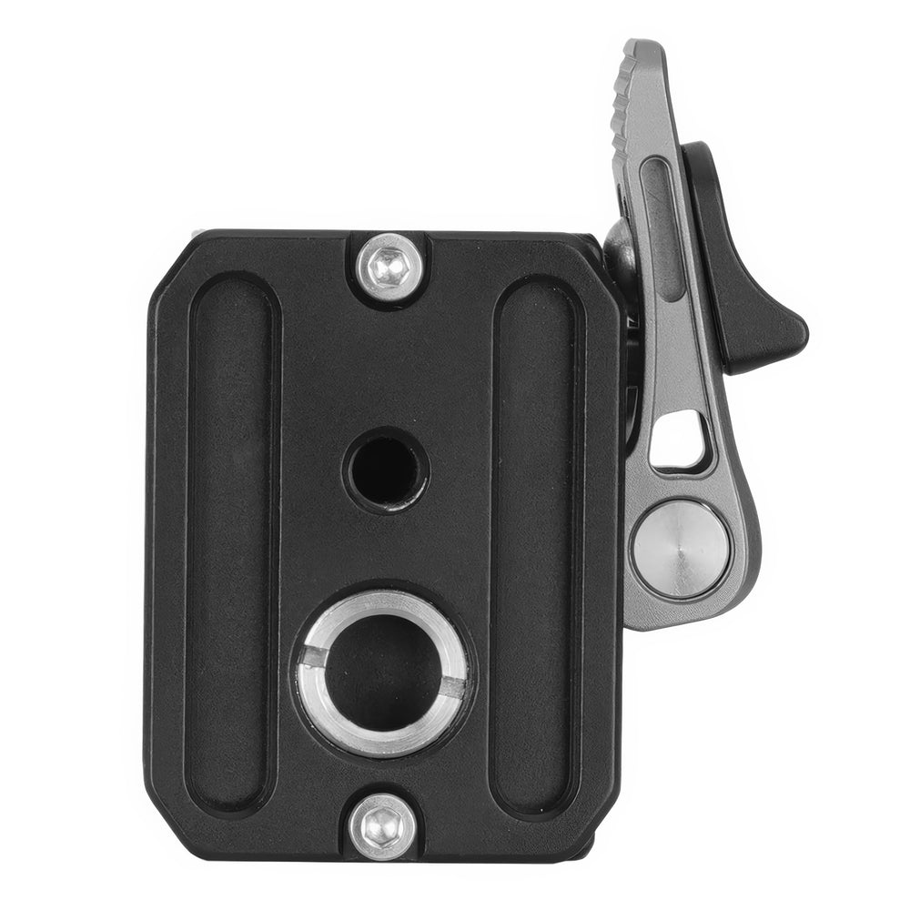 The base fits directly into any Arca-compatible clamp. For non-Arca tripods, the 1/4" threaded hole allows attachment to any quick release plate or directly onto a tripod or monopod.