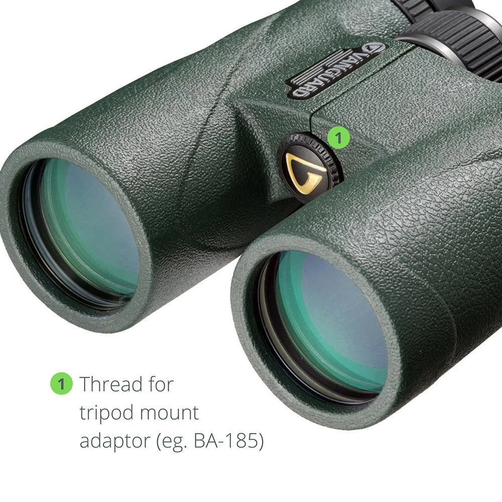 For extended viewing sessions, the binoculars can be tripod-mounted using the optional Vanguard BA-185 adaptor (sold separately).