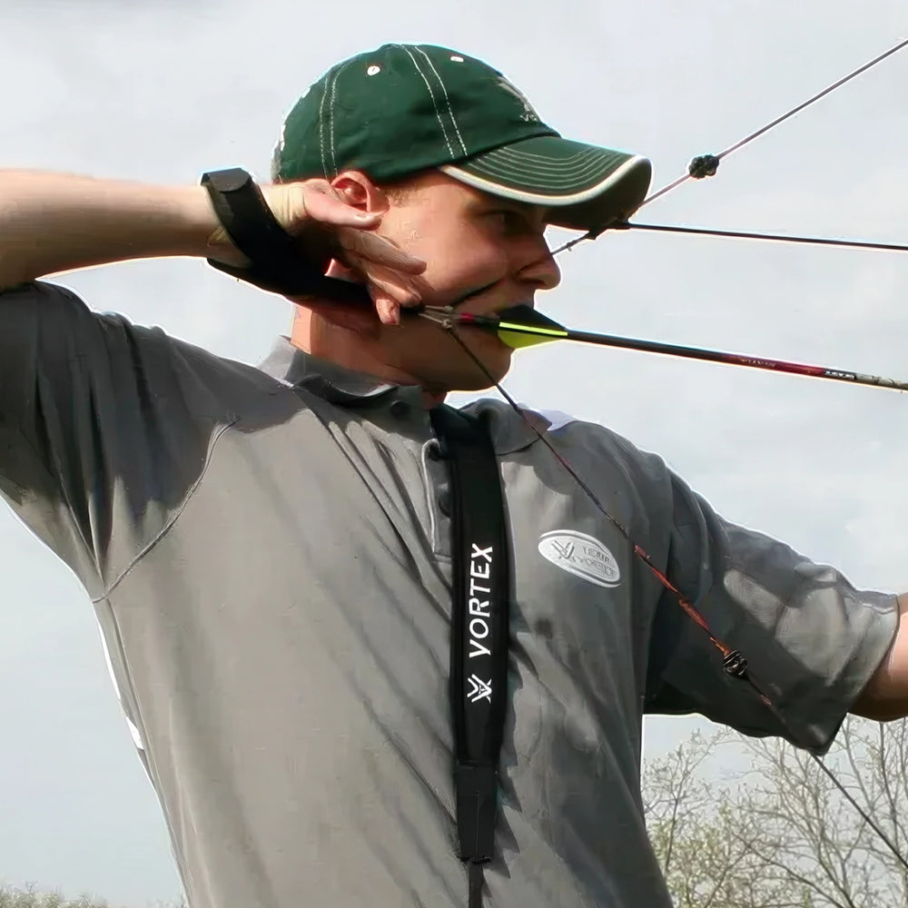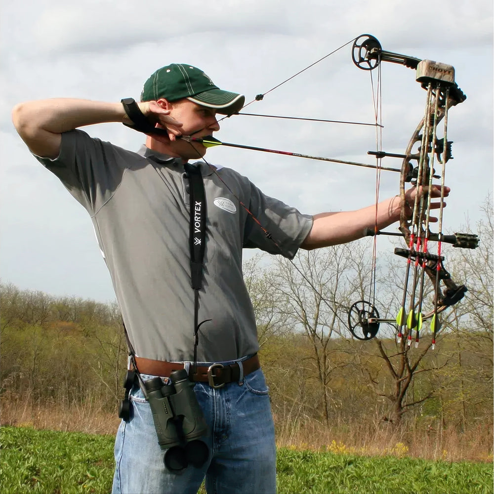 The extended length of the strap allows archers to comfortably carry binoculars without interference when drawing or aiming their bow.