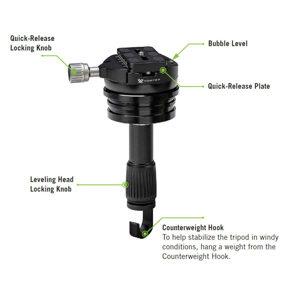 The leveling head offers smooth, intuitive control, ensuring that you have precise handling when making adjustments. It is designed for ease of use, even in demanding conditions, providing a stable base for your equipment.