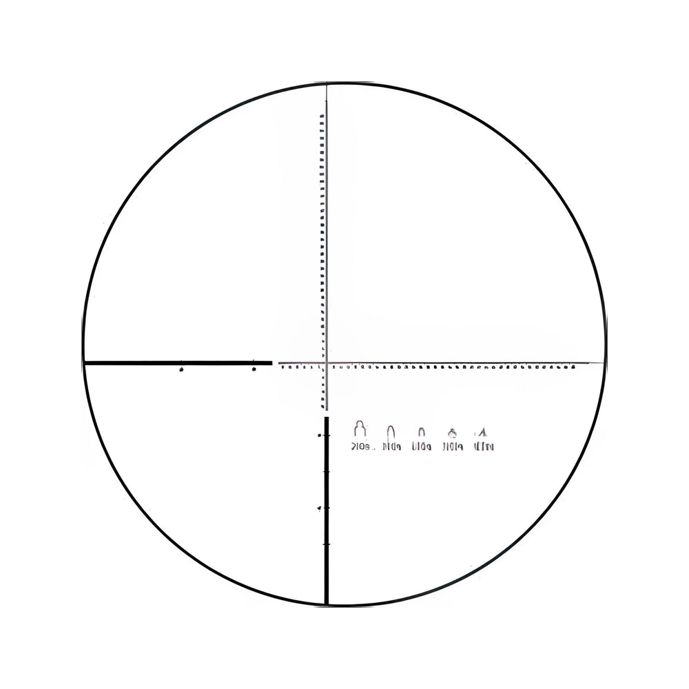 This reticle uses MRAD-based subtensions and includes silhouettes for quick ranging. The angular measurements help calculate range to known-distance objects with precision.