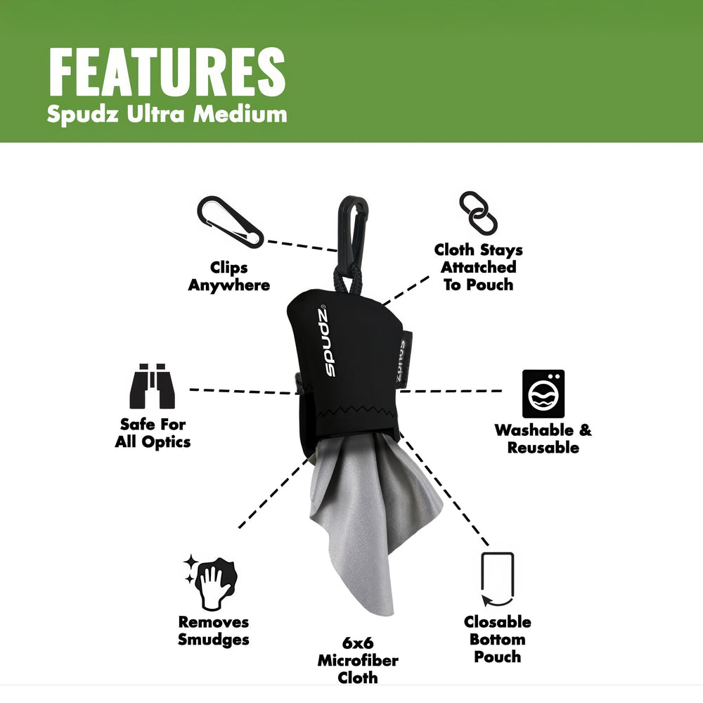 Designed to safely clean coated and non-coated optics, the Spudz cloth removes smudges, fingerprints, and dust from lenses, glasses, and screens without scratching. Its washable and reusable design ensures long-term value, while the weather-resistant pouch protects the cloth in all conditions.