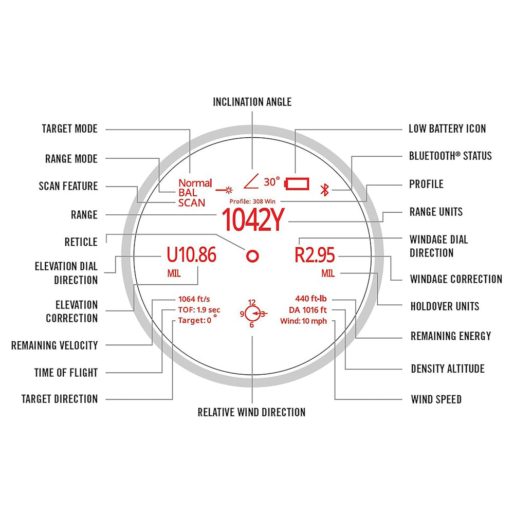 A bright active matrix red OLED display puts range, wind, and ballistic data directly in your view.