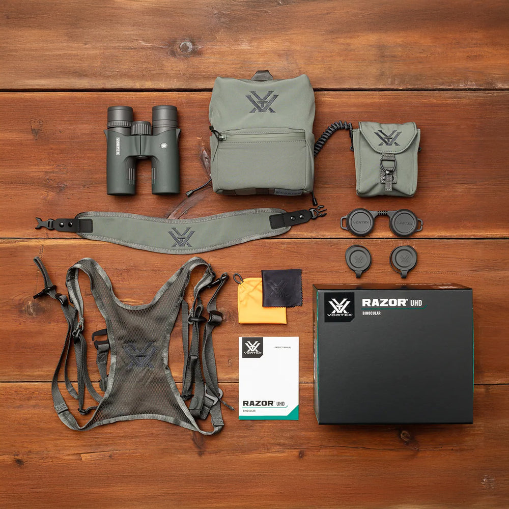 For those who know unforgettable moments don’t happen by chance, Razor® UHD stands at the peak of the Vortex® optics technology—delivering unmatched clarity and low-light performance that once-in-a-lifetime hunts demand. With rugged construction and smooth ergonomic controls, these binoculars offer an exceptional experience.